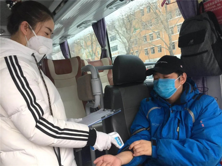 青年志愿服務(wù)隊(duì)隊(duì)員在公司通勤車(chē)上為乘車(chē)人員測(cè)量體溫
