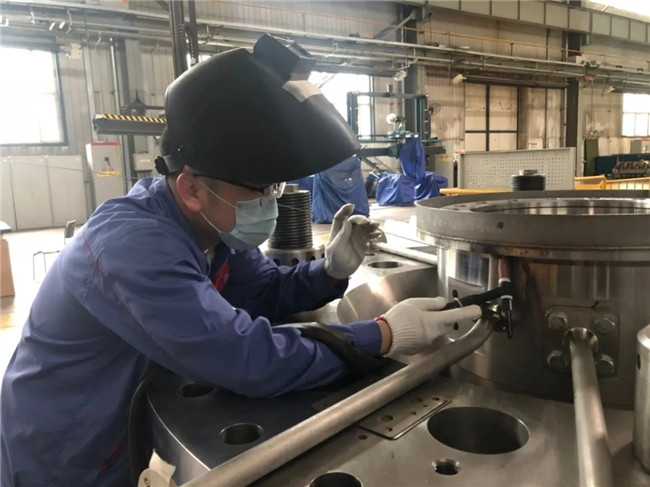 哈電集團(tuán)動(dòng)裝公司核電制造部黨員王向春正在焊接福清項(xiàng)目輔助系統(tǒng)管路。