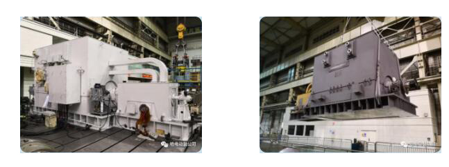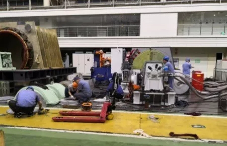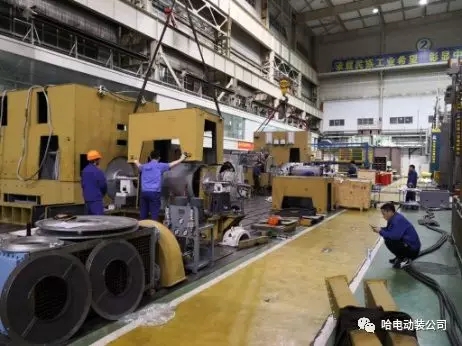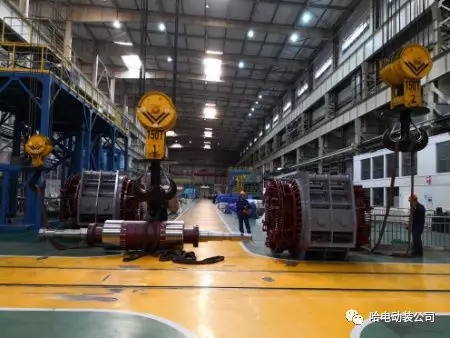 電機制造部裝配工段在核電制造部吊掛配合下同時進行第五臺總裝、第六臺電機預(yù)裝工作