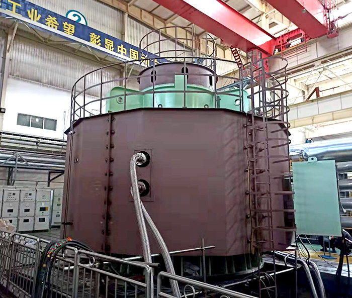 三門核電站海水循環(huán)水泵電機(jī),額定功率7700kw,電壓等級(jí)10kV,工作轉(zhuǎn)速164r/min,電機(jī)極數(shù)為36極,最大設(shè)計(jì)推力為280噸,循泵電機(jī)整體重量為160噸,對(duì)設(shè)計(jì)、工藝、制造、檢驗(yàn)均提出較高要求。此電機(jī)為目前立式異步電機(jī),轉(zhuǎn)子采用鼠籠結(jié)構(gòu);上下機(jī)架采用探入式結(jié)構(gòu),降低整個(gè)泵組的高度,提高的循泵電機(jī)的穩(wěn)定性;全新開發(fā)了36極異步電機(jī)的槽配合,使得循泵電機(jī)具有較低的振動(dòng)和噪音水平。三門核電循泵電機(jī),擁有8項(xiàng)發(fā)明專利授權(quán),是擁有完全的自主知識(shí)產(chǎn)權(quán)的產(chǎn)品,利于AP1000和CAP1400核電站國(guó)內(nèi)建造和海外出口。目前,首臺(tái)循泵電機(jī)已經(jīng)順利通過型式試驗(yàn)。